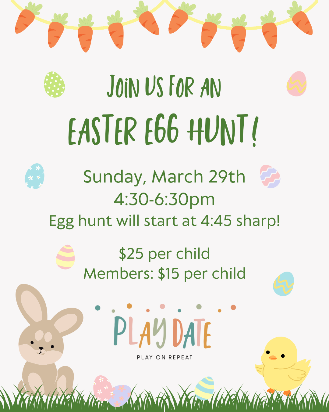 Yes—it’s time to start talking about Easter! Join us for a toddler-friendly Easter event designed just for little ones. This special event includes a calm, age-appropriate egg hunt, Easter crafts and coloring, a color sorting activity, and a chance to take a sweet family photo. All held in a safe space without big kids.